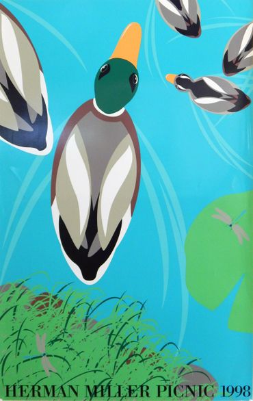 At Herman Miller, much of Kathy's design work was more technical or information design but she took over designing Herm Miller Picnic Posters after Steve Frykholm retired from designing the posters. Her series of 11 posters is in the permanent collection at the Henry Ford Museum and two are in the Library of Congress.